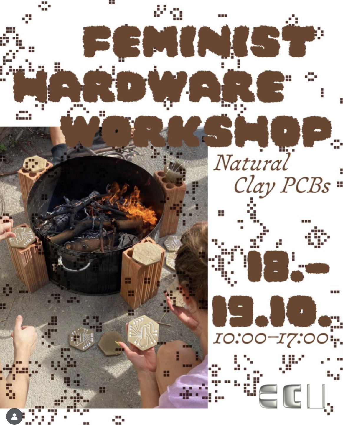 Feminist Hardware speculates on technologies that can spark debates about fair trade, ethical, biodegradable hardware in the spirit of environmental justice. We build circuits that utilise traditional craft and collaborative knowledge as an artistic practice to promote decolonial thinking. Our PCBs (Printed Circuit Boards) are made from wild clay, mined in the forest and fired at a Danube Island barbecue site. A project by Patrícia J. Reis and students from her course.