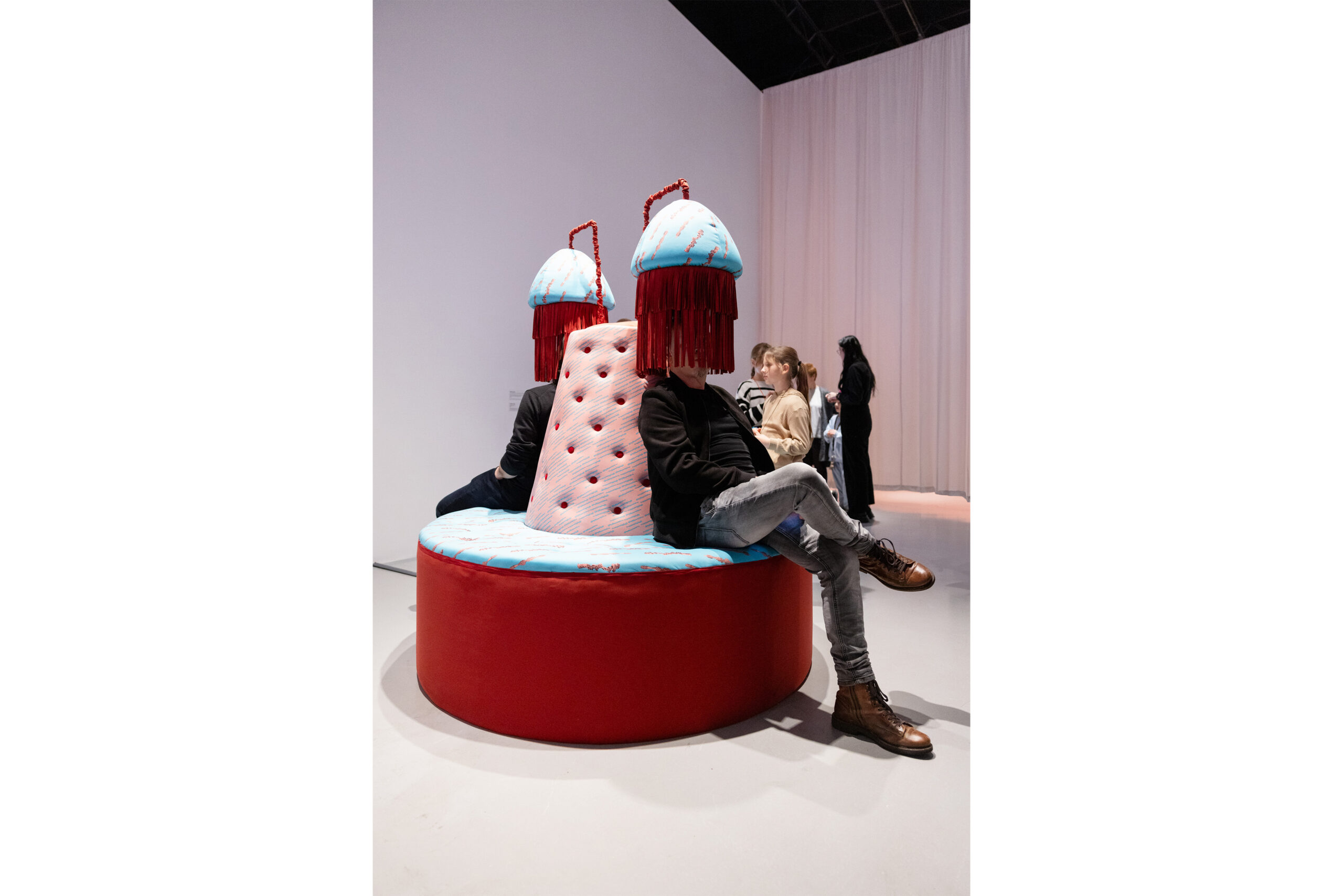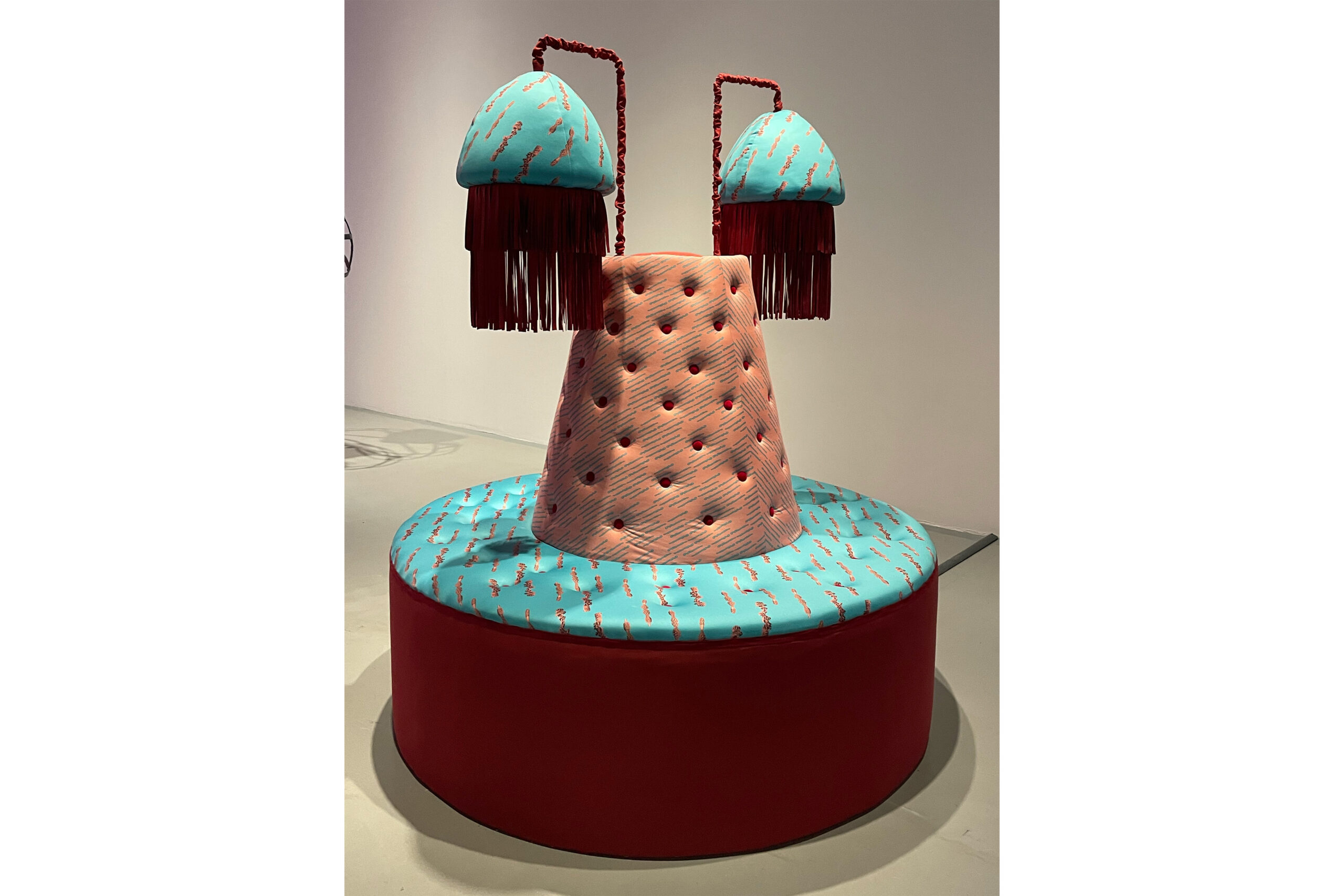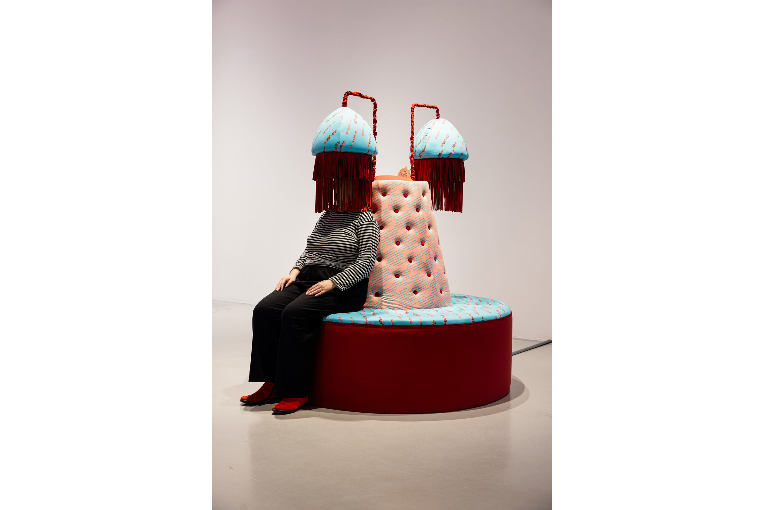 In Display Island, Reis focuses on the physical involvement of participants. The installation activates the viewers’ sensory systems and, in response to the excess of images dominating contemporary visual culture, proposes an alternative mode of engagement—one that operates not primarily through sight, but through bodily and auditory perception. The circular couch installation features a sound work delivered through sound showers shaped like lampshades. The piece takes the form of a spoken, spell-like manifesto. Through layered whispers and declarative voices, it invokes Medusa and the Odalisque as guardians of embodied difference, transforming a critique of patriarchy and the commodification of pleasure into a sensorial act of resistance and remembrance. Interwoven with the voice, a mystical noise is both heard and physically felt through transducer speakers embedded in the couch. In this way, Reis explores new forms of communication between humans and technology grounded in sensuality and intuition. Her works function as laboratories of embodied perception, in which the body is reclaimed as a full-fledged instrument for cognition and interaction with the world. The textile pattern designed by the artist is based on a schematic drawing of a silicone sex toy that simulates anal and vaginal canals. The toy was sectioned in half, its interior 3D-scanned, and translated into a simplified line drawing that maps the different internal channels. By visualizing these simulated cavities, the work reveals how far such representations of female anatomy diverge from bodily reality—producing distorted and ultimately offensive abstractions. These forms are simultaneously concealed beneath a seductive silicone surface, designed to appeal to and attract the user.