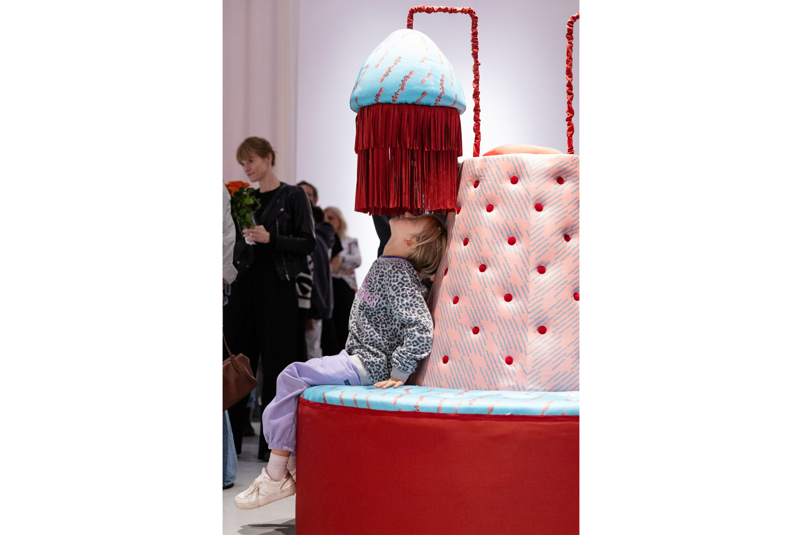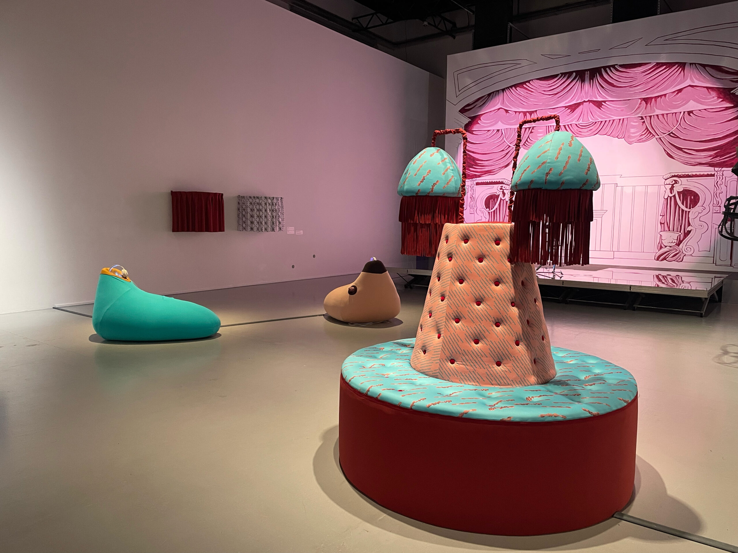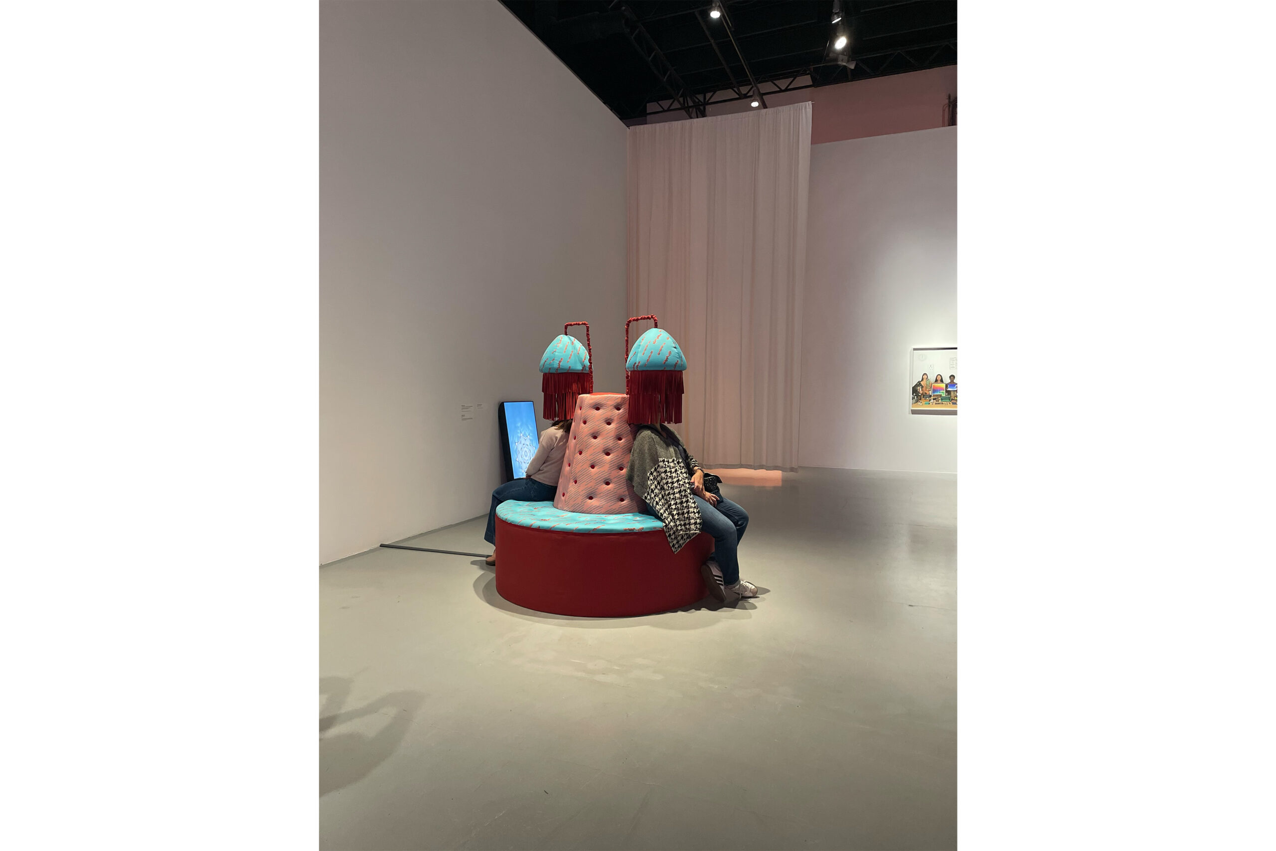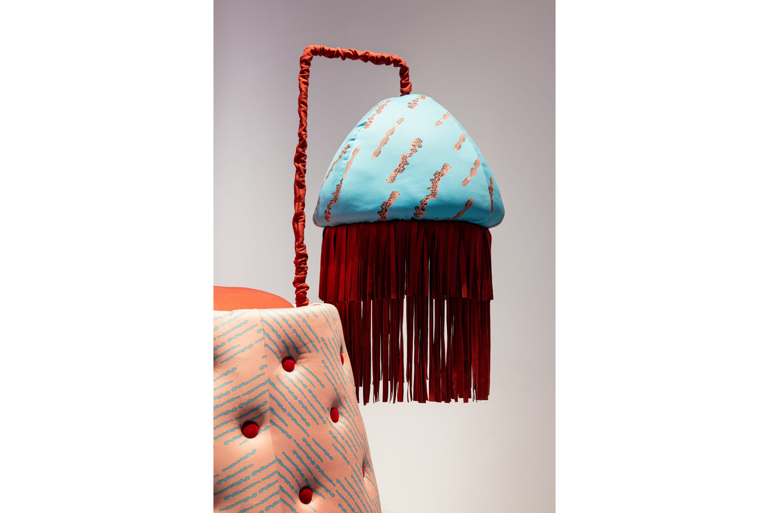 In Display Island, Reis focuses on the physical involvement of participants. The installation activates the viewers’ sensory systems and, in response to the excess of images dominating contemporary visual culture, proposes an alternative mode of engagement—one that operates not primarily through sight, but through bodily and auditory perception. The circular couch installation features a sound work delivered through sound showers shaped like lampshades. The piece takes the form of a spoken, spell-like manifesto. Through layered whispers and declarative voices, it invokes Medusa and the Odalisque as guardians of embodied difference, transforming a critique of patriarchy and the commodification of pleasure into a sensorial act of resistance and remembrance. Interwoven with the voice, a mystical noise is both heard and physically felt through transducer speakers embedded in the couch. In this way, Reis explores new forms of communication between humans and technology grounded in sensuality and intuition. Her works function as laboratories of embodied perception, in which the body is reclaimed as a full-fledged instrument for cognition and interaction with the world. The textile pattern designed by the artist is based on a schematic drawing of a silicone sex toy that simulates anal and vaginal canals. The toy was sectioned in half, its interior 3D-scanned, and translated into a simplified line drawing that maps the different internal channels. By visualizing these simulated cavities, the work reveals how far such representations of female anatomy diverge from bodily reality—producing distorted and ultimately offensive abstractions. These forms are simultaneously concealed beneath a seductive silicone surface, designed to appeal to and attract the user.